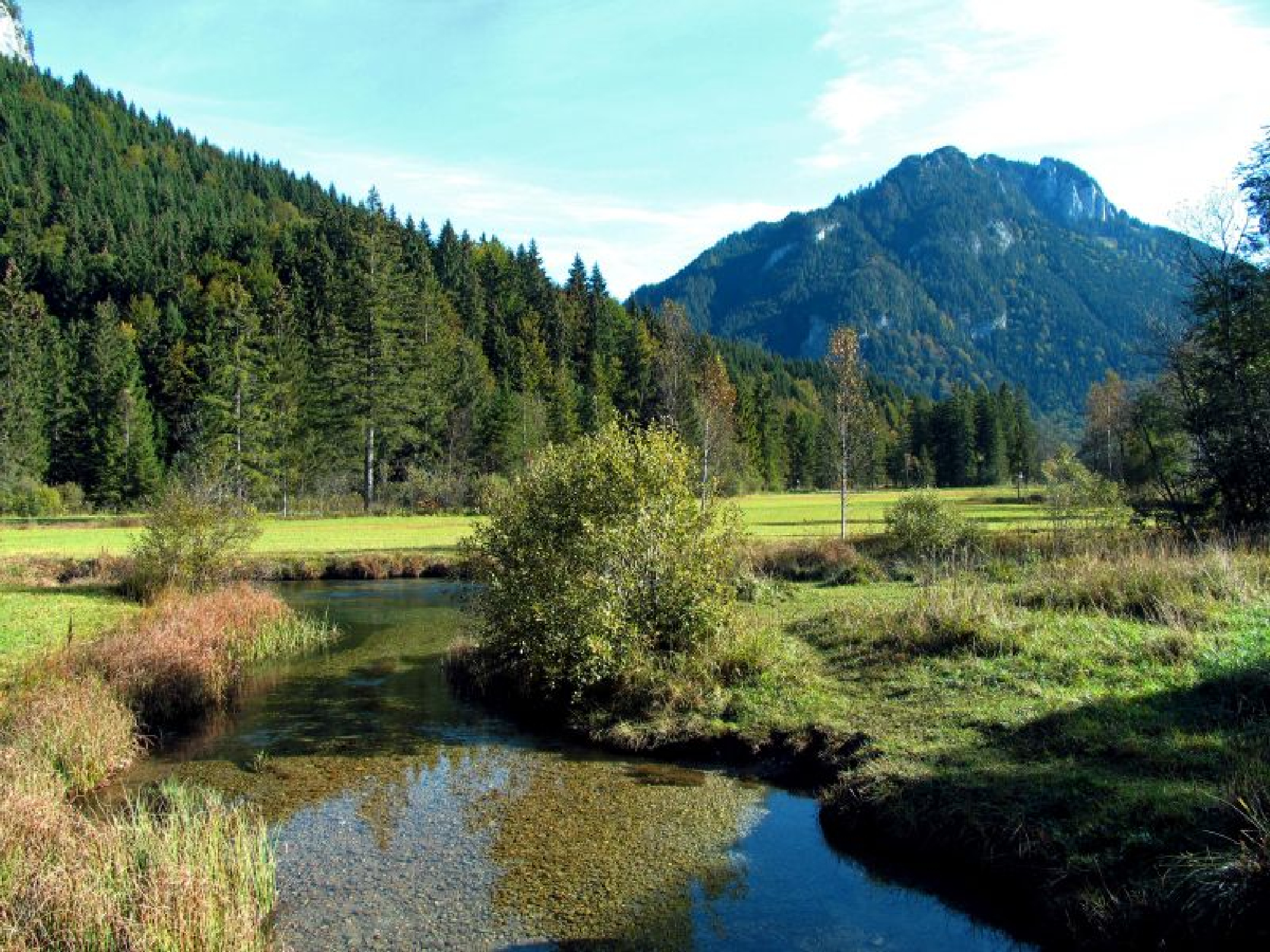 Auf eiszeitlichen Spuren begeben sich Urlauber im lieblichen Graswangtal. Hier liegen im Naturschutzgebiet Ettaler Weidmoos die Ammerquellen: Mal tritt das Wasser als glasklar sprudelnder Quelltopf an die Oberfläche, mal versickert es im lockeren Schotter, mit dem die letzte Eiszeit das Graswangtal aufgefüllt hat. Das Besondere: Das Wasser, das in den oberen Schichten dahinsickert, fließt in die Ammer, jenes in den tiefen Schichten speist die Loisach. Diese einzigartige Naturlandschaft bietet seltenen Tieren und Pflanzen ein Zuhause, im Sommer blühen im Weidmoos mehr als ein Dutzend Orchideenarten, die von den Wanderwegen gut beobachtet werden können. Die Ranger des Naturparks haben übrigens an einer der Quellen eine kleine Aussichtsplattform errichtet, so kann man einen Blick darauf werfen, ohne die Wege verlassen zu müssen und ohne die sensible Flora und Fauna zu stören. Tipp: Die Ammerquellen sind auch Station auf dem Meditationsweg Ammergauer Alpen, der auf einer Länge von 85 Kilometern in 14 Etappen zu den schönsten Kraftorten der Region führt.