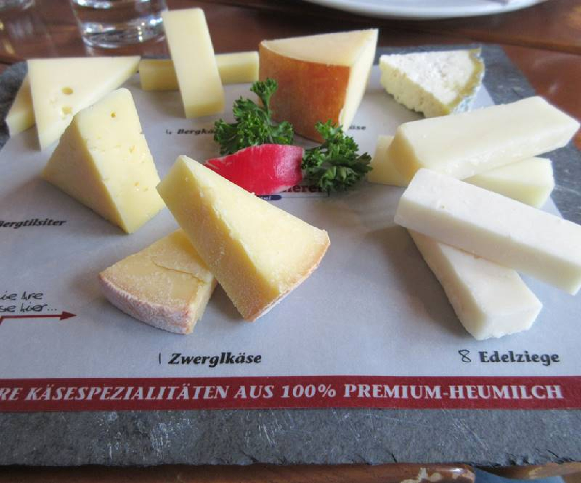 Für die Mittagsjause geht’s dann in die Sennerei-Küche. Hier testeten wir die verschiedensten Käsesorten: Vom Bergtilsiter über den klassischen Bergkäse bis hin zum allseits bekannten Graukäse konnte alles probiert werden, was das Käseherz nur begehrt. Wir empfehlen vor allem den Bergkäse, denn der kann sogar bei Laktose-Intoleranz verzehrt werden, da er nach 6 Monaten Reifungszeit laktosefrei ist. Falls die Kleinen während der Jause unruhig werden sollten, steht auf der Terrasse auch ein netter Kaufmannsladen, der zum Spielen einlädt.