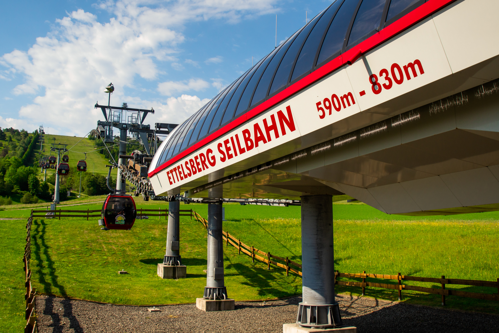 Mit den geräumigen Panoramakabinen mit großen Fenstern der Ettelsberg-Seilbahn können Groß und Klein bequem auf eine Höhe von 838 Metern fahren. Da die Kabinen in der Tal- und Bergstation besonders langsam fahren, kann man bequem ein- und aussteigen - auch mit Kinderwagen oder Rollstühlen. Oben angekommen, eröffnet sich die ganze Vielfalt der Attraktionen am Ettelsberg.