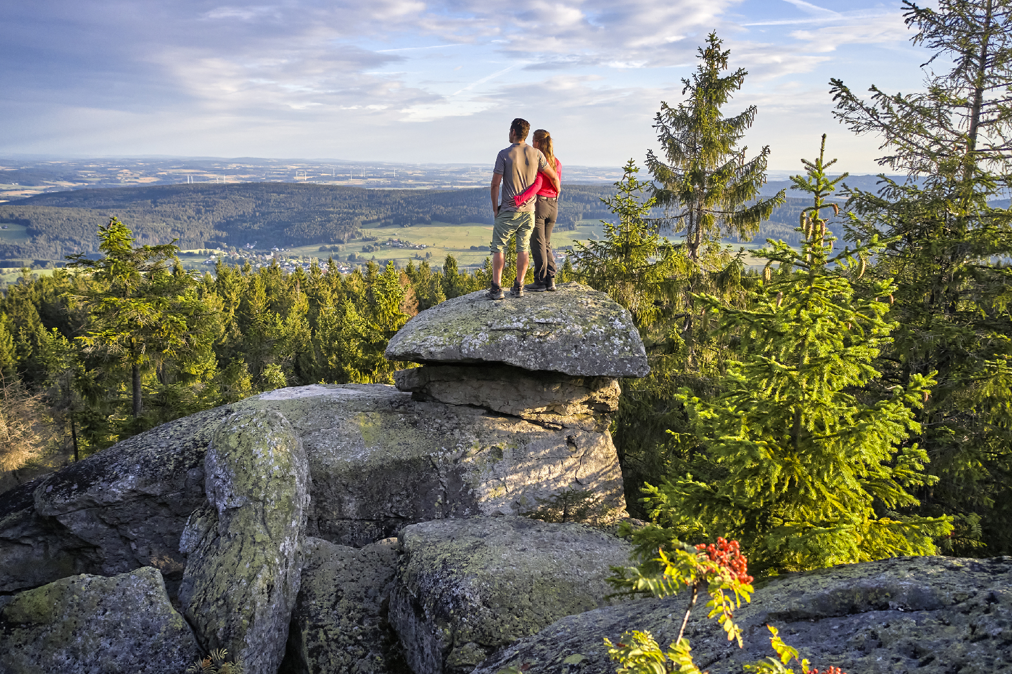 Das wald- und gesteinsreiche Fichtelgebirge erhebt sich hufeisenförmig auf bis zu 1.000 Meter und gilt als eine der schneesichersten Landschaften Deutschlands. Der Ochsenkopf lockt ganzjährig Urlauber in das beliebte Natur- und Aktivgebiet. Kulturliebhabern ist die Region insbesondere durch die jährlich stattfindenden Wagner- und Luisenburg-Festspiele bekannt. Genussreisende werden verwöhnt mit lokalen Speisen wie Sauerbraten mit Lebkuchensoße oder mit Kräuterspezialitäten von den Partnern des Vereins essbares fichtelgebirge®. Entlang der Porzellanstraße geben renommierte Hersteller wie Rosenthal und Hutschenreuther Einblicke in die lange Tradition der Porzellanherstellung und bieten hochwertiges Porzellan im Direktverkauf.