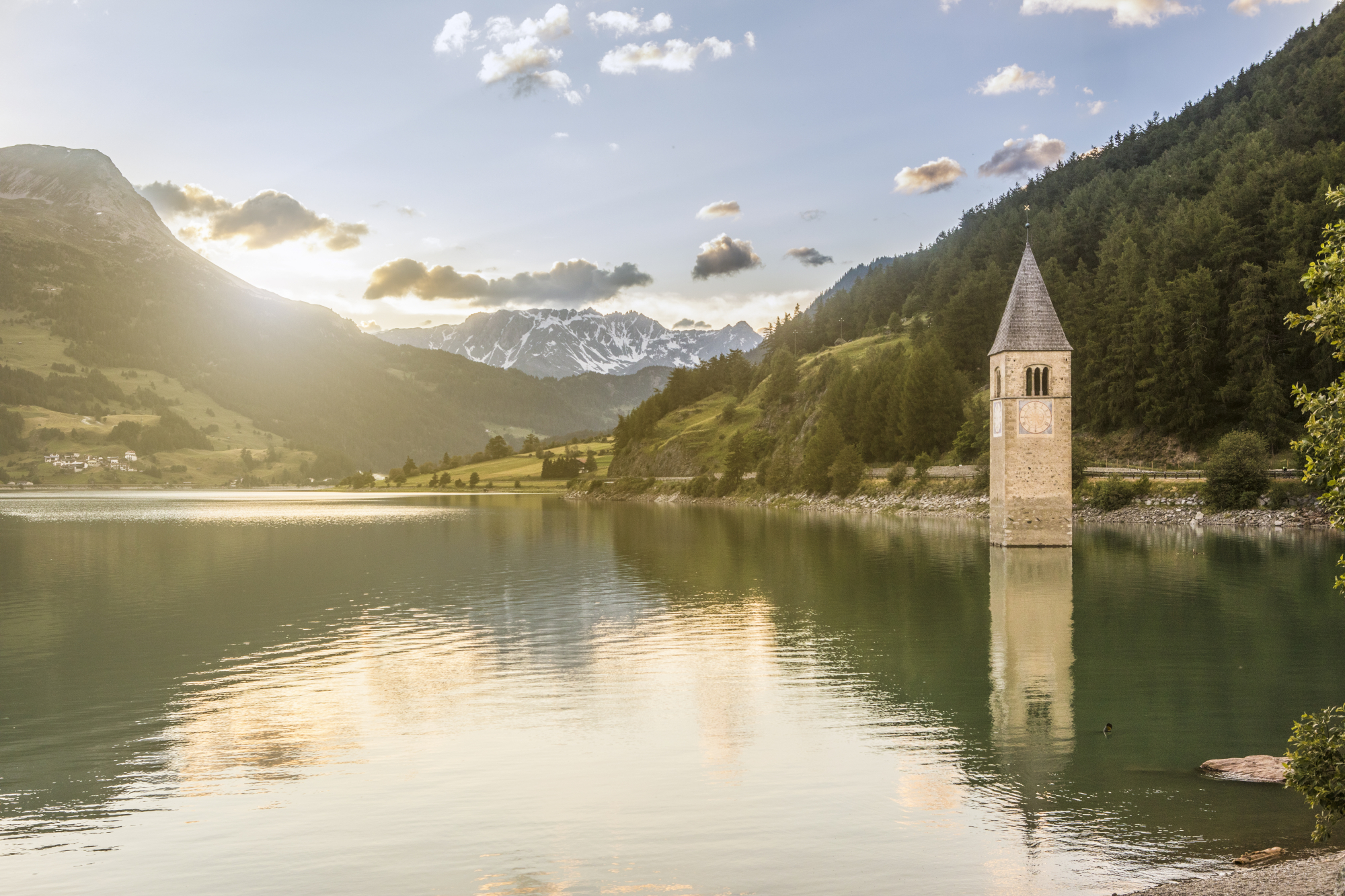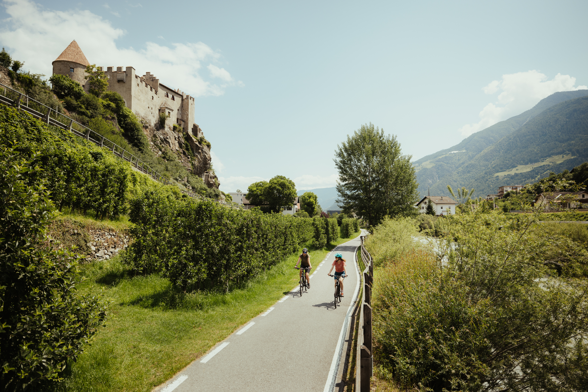 Die Bikestrecke durch den Vinschgau startet am Reschensee, wo der berühmte Kirchturm von Graun aus dem Wasser ragt, der heute zu einem Symbol des Vinschgau geworden ist. Vom Reschensee führt der Fahrradweg nach Burgeis, wo sich das Kloster Marienberg befindet, und weiter durch das mittelalterliche Glurns. Schließlich führt die Strecke durch das Marmordorf Laas, den Vinschgauer Hauptort Schlanders, weiter nach Latsch und Kastelbell und endet nach über 80 Kilometern in der Kurstadt Meran. Dank ihrer kulturellen Vielfalt ist die Etschradroute eine der beliebtesten Radtouren Italiens.
