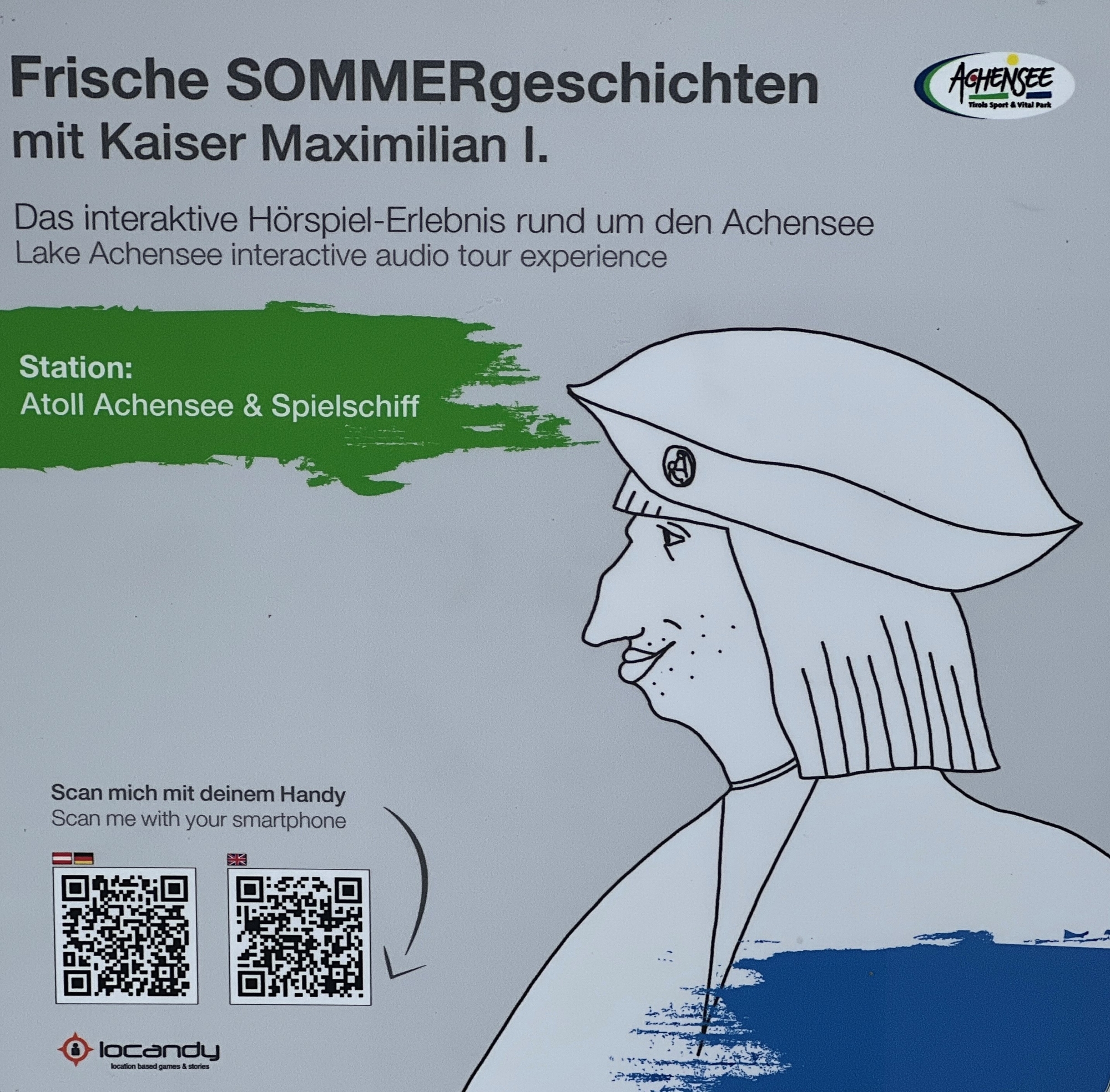Im neuen interaktiven Hörspiel-Erlebnis entführt die historische Erzählfigur Kaiser Maximilian I. Besucherinnen und Besucher auf eine spannende Reise durch die Region Achensee. An 24 Stationen stehen mittels GPS oder über das Scannen eines QR-Codes unterschiedliche Audiodateien, Texte und Fotos bereit, die Informationen über den jeweiligen Ort unterhaltsam vermitteln. Zudem warten bei einigen Hörspiel-Stationen interaktive und spielerische Elemente wie Rätsel oder sonstige Aufgaben auf kleine und große Besucher. Sind die Achensee-Hörspiele einmal am Handy heruntergeladen, funktioniert die weitere Nutzung der "Locandy-App" vor Ort gänzlich ohne Internet-Verbindung.