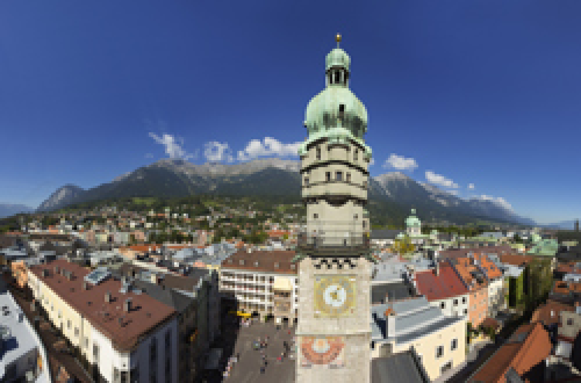 Mitten in der Innsbrucker Altstadt steht der Stadtturm. Mit seiner Höhe von 51 Metern ist er eines der Wahrzeichen der Stadt, hier war einst das Gefängnis, die Stadtverwaltung und Turmwächter untergebracht. Heute ist der Turm als Aussichtsplatz beliebt, über eine Treppe mit 133 Stufen gelangt man auf eine Plattform mit Aussicht auf Stadt und die umliegende Berge.