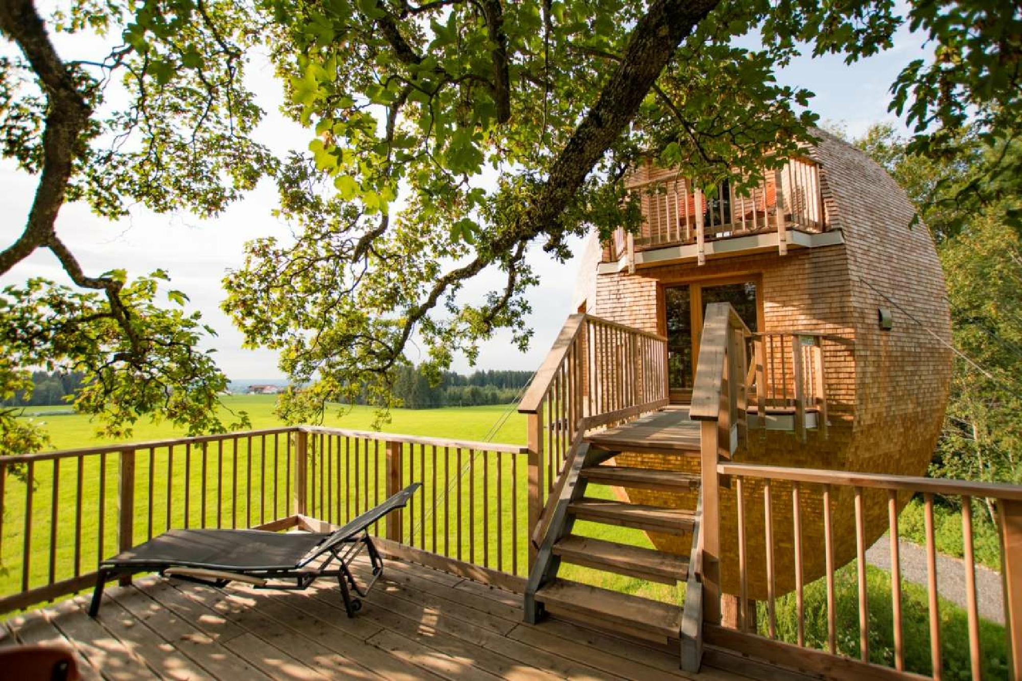 Wenn die Bäume im Sommer in ihrer schönsten Pracht blühen, dann sind die Baumhäuser fast nicht einsehbar. Auf der Sonnenveranda ist man dann ganz für sich und kann die Natur, Geborgenheit und Freiheit genießen. Insgesamt gibt es sechs traumhafte Baumhäuser. Davon sind zwei sogenannte Landeier, die ihre Urlaubsgäste schützend wie ein Konkon umgeben und durch ihre Einrichtung aus heimischem Altholz für besonders kuschelige Stunden sorgen. Beim Bau und der Gestaltung aller Baumhäuser hat Familie Bechteler Wert auf Umweltverträglichkeit und Nachhaltigkeit gelegt.