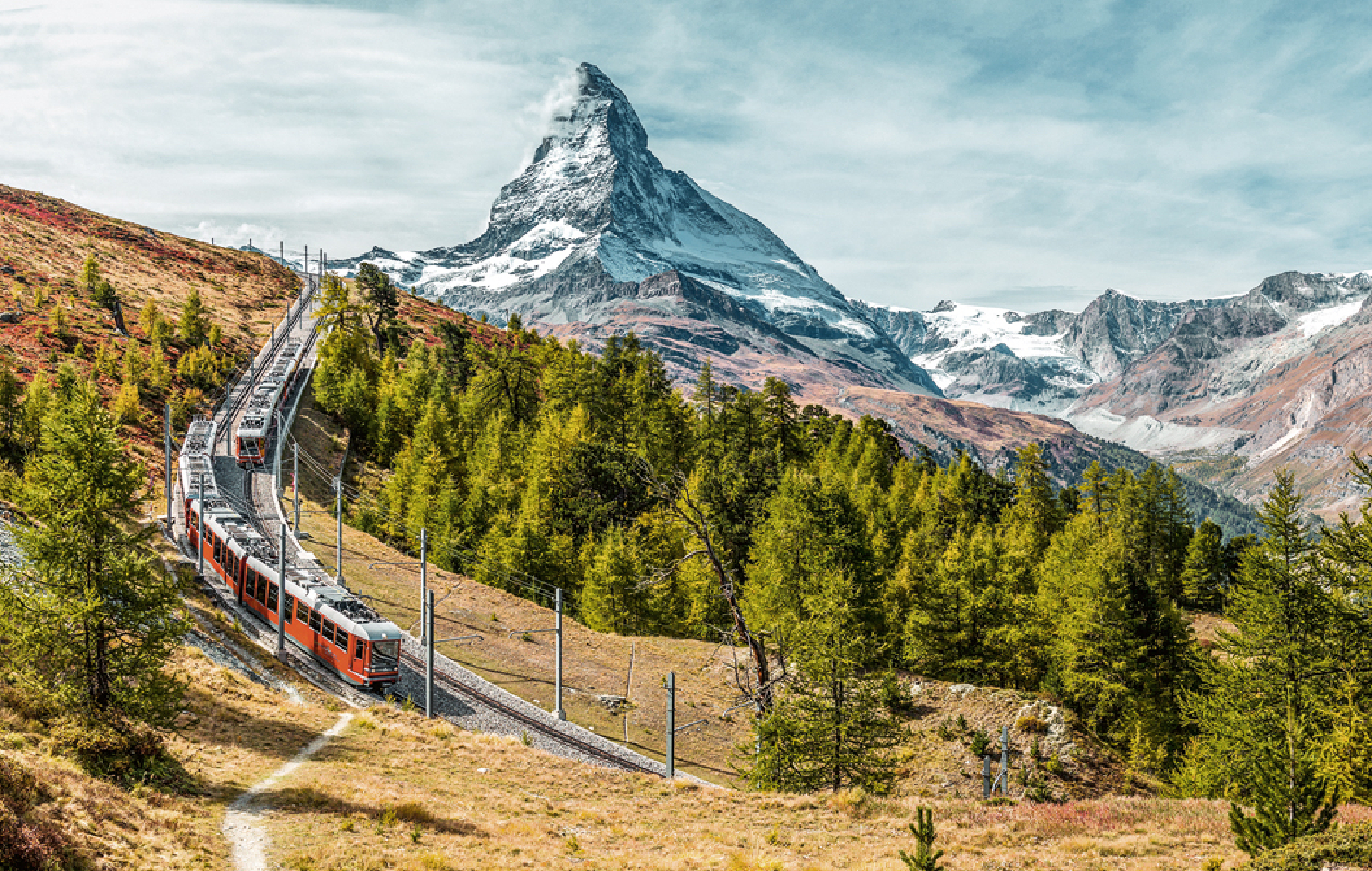 Die höchste Zahnradbahn Europas bringt ihre Fahrgäste von Zermatt hinauf auf den Gornergrat – auf 3.089 Metern Höhe. Schon beim Startpunkt zeigt sich das Matterhorn in voller Pracht, doch die Aussicht steigert sich mit jedem Meter. Je höher der Zug fährt, desto gewaltiger werden die Gletscher, Gipfel und Schneefelder, die das Panorama säumen.