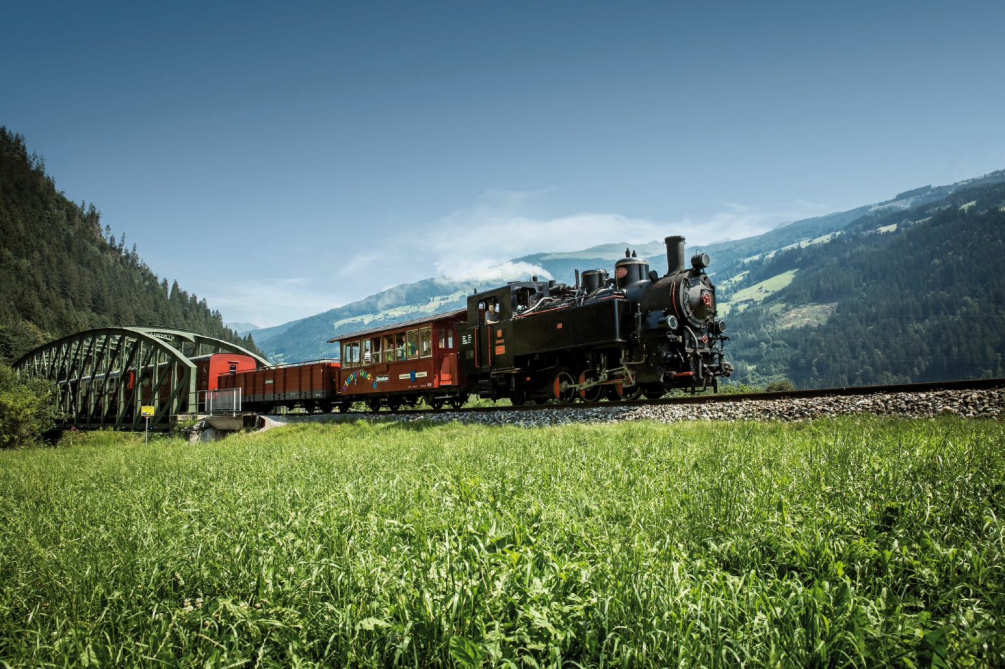 Wer es gemütlich, urig und landschaftlich reizvoll mag, wird die Zillertalbahn lieben. Auf der 32 Kilometer langen Schmalspurstrecke von Jenbach nach Mayrhofen tuckert der Zug gemütlich durchs Tiroler Zillertal – flankiert von schroffen Alpengipfeln, satten Wiesen und klaren Flüssen.