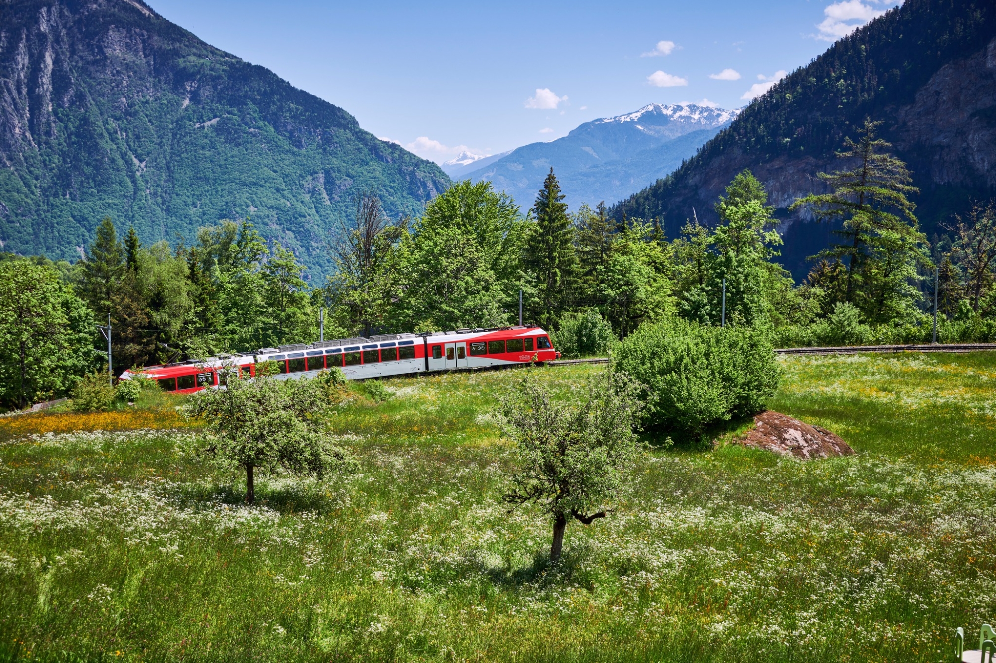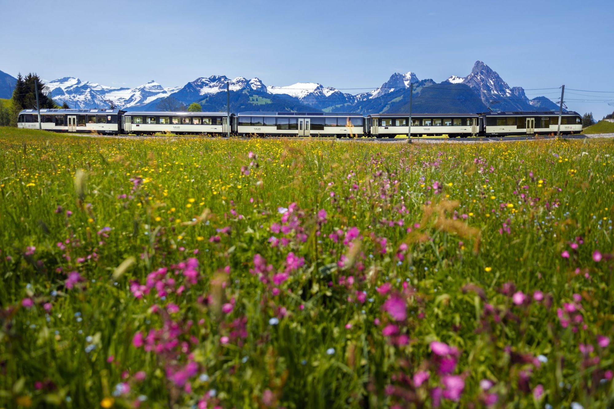 Die Strecke führt am glitzernden Brienzersee entlang, durch Interlaken, vorbei an den mächtigen Viertausendern Eiger, Mönch und Jungfrau, durch das Simmental und schließlich hinab zum Genfersee, wo sich in Montreux ein mediterranes Flair entfaltet. Die Züge mit ihren großen Panoramafenstern – teils sogar mit nostalgischem Belle-Époque-Ambiente – machen die Fahrt zu einem Erlebnis für alle Sinne.