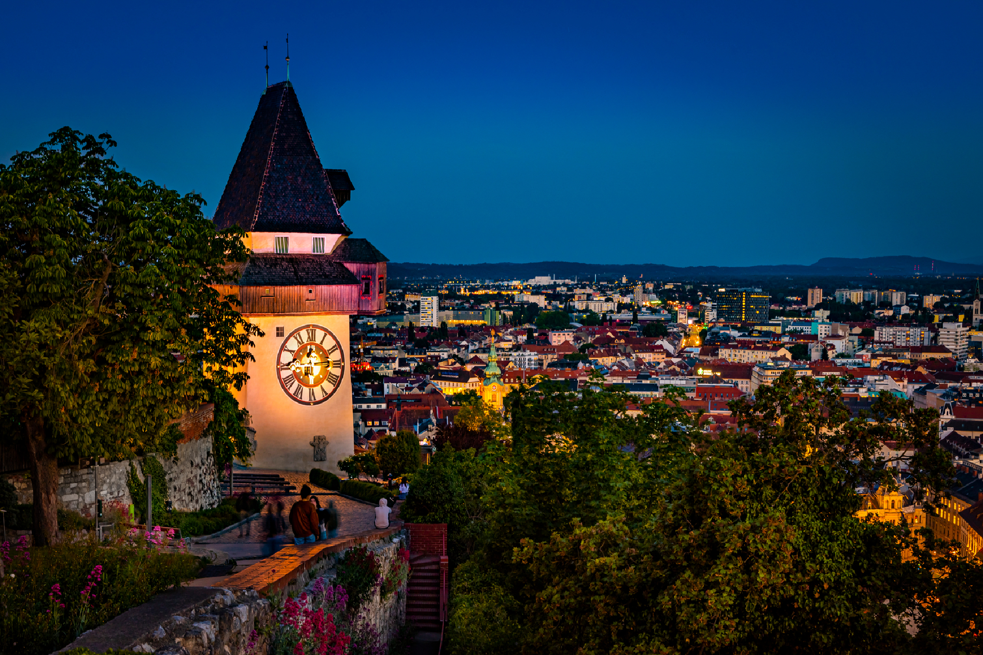 Der wuchtige Fels des Grazer Schlossbergs ragt über dem Hauptplatz auf, nach oben führen 260 Stufen der Schlossbergtreppe, die Schlossbergbahn oder der Schlossberglift. Oben kann man den Uhrturm, das Wahrzeichen von Graz besichtigen, es ist eines der ältesten Gebäude der Stadt. Außerdem stehen hier der 34 Meter hohe Glockenturm, die Kasematten, die Reste der alten Burg und eine Reihe kleinerer Gebäude und Objekte. Der Schlossberg ist zudem von einem artenreichen Laubwald bewachsen, einige Teile sind angelegt und beherbergen unter anderem japanische Zierkirschen.