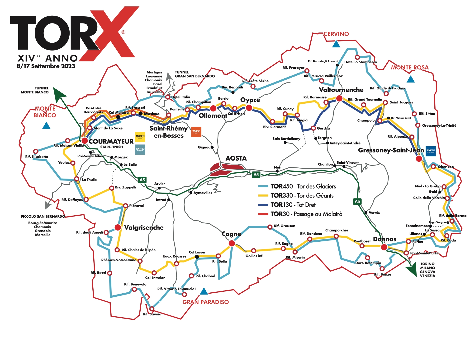 Vom 8. bis 17. September 2023 können sich Bergläufer bei den TorX-Rennen im Aostatal der ultimativen Herausforderung stellen: Vier verschiedene Rennen mit unterschiedlichen Längen stehen auf dem Programm - von ultrahart mit 450 km Länge und über 32.000 Höhenmeter bis zum Tagesrennen mit 30 km und 2.300 Höhenmeter.