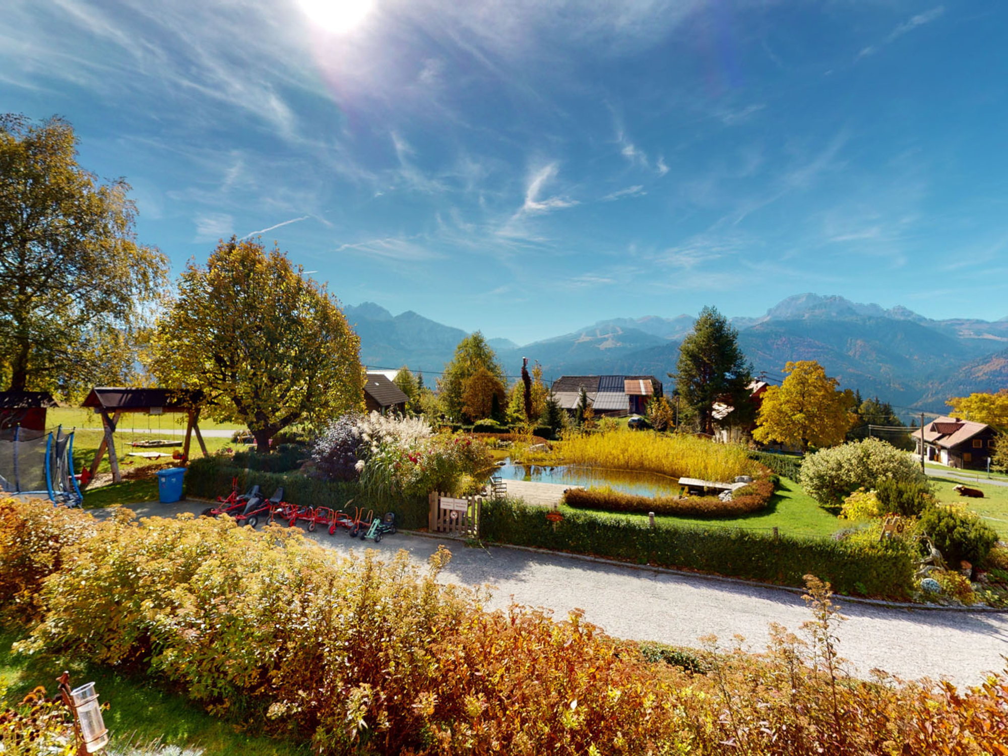 Warme Luft vom Mittelmeer und die hochalpine Landschaft der Alpen vor den Augen. Das ist Urlaub in Kärnten, im Süden Österreichs. Unser Motto: Natur erleben mit der ganzen Familie! Über 1000 km bestens markierte Wanderwege. Egal ob gemütlicher Spaziergang, einfache Bergwanderungen, anspruchsvolle Bergtour vom Klettersteig bis zur Kletterroute oder durch eine tosende Klamm – bei uns kommt jeder voll auf seine Kosten. Ob eine richtige Bergtour mit atemberaubender Aussicht oder ein gemütlicher Spaziergang auf einen der kleineren Gipfel, bei uns ist beides möglich. Regelmäßig bieten wir auch kleine oder große Wanderungen an. Fragen Sie an der Rezeption nach den geplanten Wanderungen! Zahlreiche urige Almhütten laden zu einer zünftigen Jause mit dem original GailtalerAlmkäse oder dem hausgemachten Speck ein. Neben den vielen Sennereien und Almhütten ragen die zum Teil markanten und schroffen Gipfel der Karnischen Alpen in den Himmel. Familienurlaub in Kärnten mit Action & Spaß In unserem kinderfreundlichen Haus fühlen sich die Kleinen richtig wohl. Eine ganze Menge an unterschiedlichen Tieren lassen jedes Kinderherz höherschlagen und schnell ist ein kuscheliger Freund gefunden. Unser warmer Naturschwimmteich liegt direkt vor dem Hotel, hat Trinkwasserqualität ist ein wahrer Magnet für Kinder. Nebenan können die Kinder fern ab von stark befahrenen Straßen oder anderen Gefahren auf unseren Spielplatz mit Go-Karts oder auf dem Trampolin ihrer Energie freien Lauf lassen. Unsere Region Nassfeld – Presseggersee bietet zahlreiche Aktivitäten für Familien mit Kindern. Ob Felsenlabyrinth, Sommerrodelbahn, Vergnügungspark Presseggersee, Aquatrail am Nassfeld – bei uns ist für jeden etwas dabei!