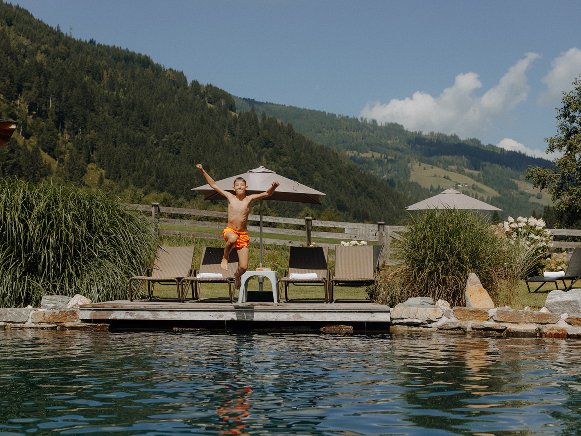 Badevergnügen pur bietet unser ca. 20x10m großer Naturschwimmteich mit großer Liegewiese und Sonnenschirmen. Genieße die natürliche Wasserqualität ohne Zusatz von Chemie. Bei uns im Familienhotel Botenwirt erleben unsere kleinen Gäste große Abenteuer - Tag für Tag - damit Langeweile ein Fremdwort bleibt. Unser Spieleparadies auf einen Blick: * Kinderspielzimmer mit Rutsche und Bällebad * große Kinderspielwiese zum Toben * Hüpfburg, Trampoline und Schaukeln * Tischtennis und Tischfußball * Kunstrasen-Kleinfeld zum Fußballspielen * Hasenhotel und Hühnerstall * Go-Karts, Dreiräder, Laufräder und vieles mehr In den Sommermonaten wartet auf die Kids jede Menge Spiel, Spaß und Spannung im Abenteuerland Kleinarl, wo sie von unseren ausgebildeten BetreuerInnen bei einem abwechslungsreichen Programm unterhalten werden - Spielkameradengarantie inklusive. Programmpunkte sind unter anderem Ponyreiten, Fischen, Brotbacken, Bogenschießen und Kinderschminken. Die Seele baumeln lassen und so richtig ausspannen kannst du in unserem Wohlfühlbereich im Dachgeschoss mit herrlichen Ausblick auf die Salzburger Bergwelt. Der Wohlfühlbereich besteht aus einer finnischen Sauna, einem Sanarium, einer Infrarotkabine, einem großzügigen Ruheraum mit Schwebeliegen und einer Dachterrasse.