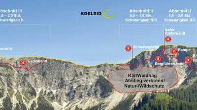 Route Der Klettersteig, Abschnitt I, folgt einer logischen Linie von Bändern und Steilstufen zum Gipfel Iseler. Im Mittelteil erwarten die Klettersteiggeher zwei Steilstufen, mit der sogenannten Schlüsselstelle „Bergführerplatte“. Der Abschnitt II führt, leicht absteigend, vom Iselergipfel zur Iselerscharte. Auf dem Panoramaweg nach Osten, folgt in ca. 10 Minuten Gehzeit der Einstieg zur Fortsetzung des Klettersteigs. Parallel zum Berggrat geht der Abschnitt III übers „Gemsband“, kurz durch ein Gehstück unterbrochen, durchs „Kanonenrohr“ und zum Ausstieg auf den Kühgundkopf.