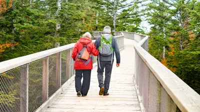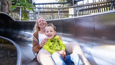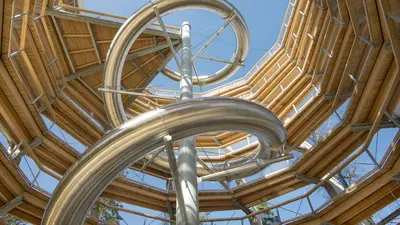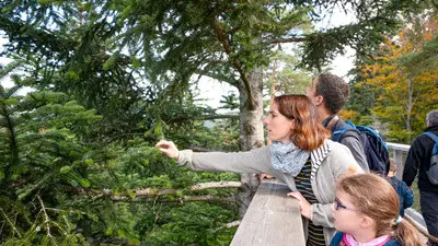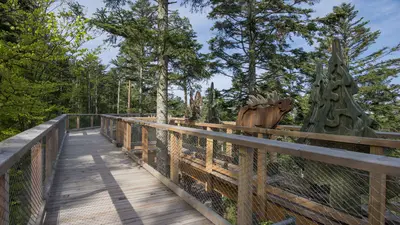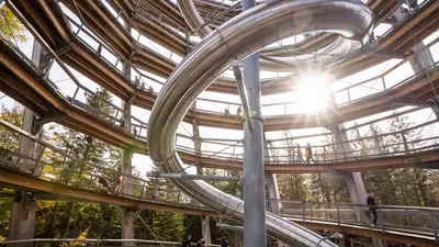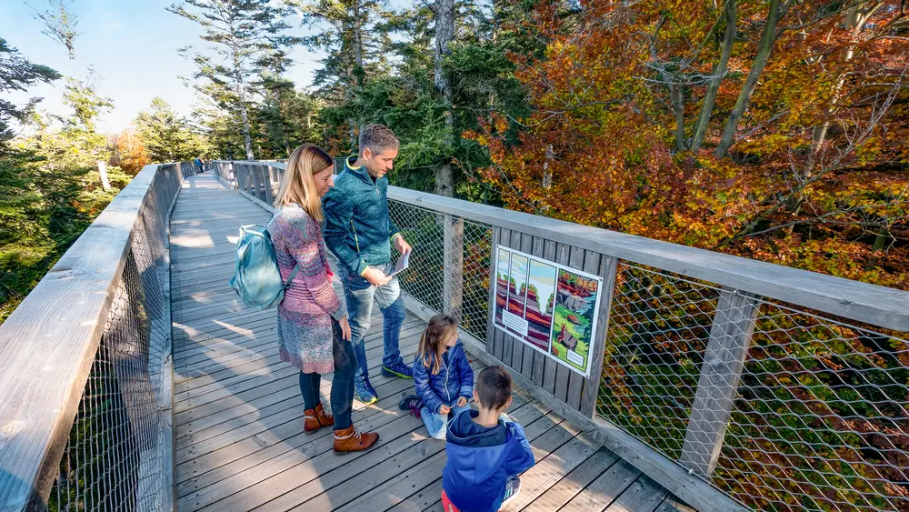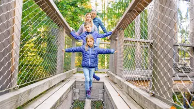 Das Highlight des Baumwipfelpfads ist der becherförmige, konische Turm, auf dem sich eine Aussichtsplattform befindet, die den weitläufigen Blick über die Region frei gibt. Die Mutigen wagen eine rasante Rutschpartie auf der 55 Meter langen Röhrenrutsche, die direkt am Ausgang des Turms endet.