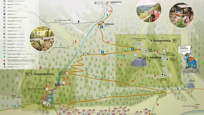 Hier beginnt die Reise in die Vergangenheit und ins Innere des Berges. Dabei führt der Knappensteig durch die Geschichte und Tradition des Kaunertaler Bergbaus. Bei der Knappenhütte kann man selbst nach Erz suchen und mit den Holz-Knappen die Jause Teilen. Zwei begehbare Knappenlöcher aus dem 16. und 17. Jahrhundert findet man entlang des weiteren Wegverlaufes.