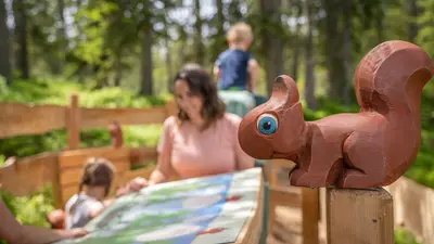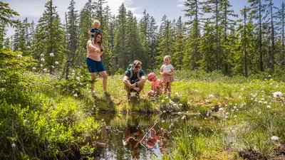 Auf der Bilderbuchrunde gibt es sieben Moorerlebnisstationen, auf denen man den Moorbewohnern Frosch, Schmetterling, Eichhörnchen und Libelle begegnet, außerdem dem Moorbaum Fichte. Begleitet wird man unterwegs von Filzi, der schlauen Moorlibelle vom Rossbrand. So erfahren Groß und Klein spielerisch mehr über das Moor, die Natur und warum man sie schützen sollte - damit ist FILZ & MOOR gleichzeitig ein Naturerlebnis-, Naturlabor- und Naturschutz-Projekt.