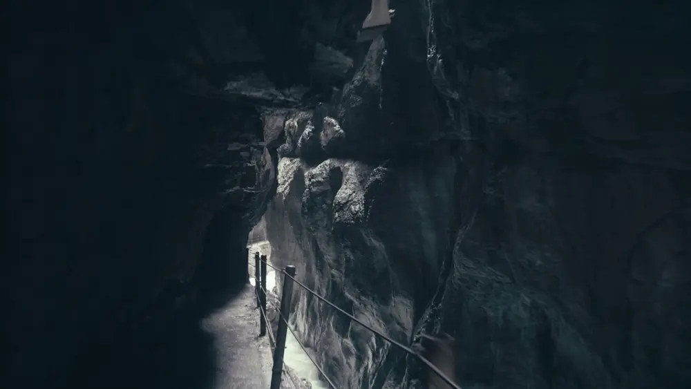 Die Partnachklamm beim Zugspitzort Garmisch-Partenkirchen ist eine tief in die Berge eingeschnittene Gebirgsklamm. Die Klamm ist bis zu 80 m tief und 700 m lang. Durch die enge Felsklamm rauscht das laut sprudelnde Wasser der Partnach ins Tal. Auf einem Steg können Urlauber am Rand der Felswände entlanggehen und unter sich die gewaltigen Wassermassen bestaunen. Die Wände der Partnachklamm stehen teilweise nur wenige Meter auseinander, sodass kaum ein Sonnenstrahl in die enge Alpenschlucht dringt.
