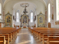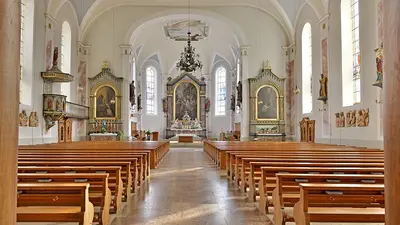 Das Altarbild entstand um 1850 und zeigt die Heiligen Drei Könige. Etwa 100 Jahre später erhielt die Pfarrkirche ihre bunten, im Nazarenenstil gehaltenen Glasfenster. Zwischen den Fenstern haben 13 geschnitzte Apostelfiguren ihren Platz gefunden.