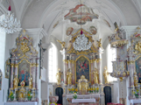 Eine zweigeschossige Empore befindet sich im Westteil des Sakralbaus. Der kunstvoll gestaltete Stuck an Fenstern, Gewölbe und Triumphbogen stammt aus der Hand von Hans Singer. Die biblisch inspirierten Deckengemälde schuf Georg Höttinger. Den Hochaltar erbaute Josef Martin Lengauer. Im Stil des Rokoko errichtete Franz Stitz die Kanzel und Seitenaltäre. Die Fertigung des Taufsteins wird Franz Offer zugeschrieben.