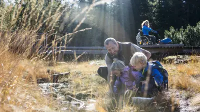Am Parkplatz Piller Moor beginnt die Wanderung inmitten des schönen Bergwaldes am Piller Sattel. Schon bald zweigt ein idyllischer Steig nach links ab. Er wurde an einigen Stellen als Prügelweg angelegt, wie es schon die Römer beim Wegebau in ähnlichem Gelände vorgemacht haben. Der Weg führt am Rande des Naturdenkmales vorbei und lässt immer wieder spannende Einblicke auf diesen interessanten Lebensraum zu. Am Moorturm angekommen kann man den Ausblick auf das etwa 1,5 ha große Naturdenkmal genießen. Dort beginnt der informative Moorlehrpfad, der nach und nach die Geheimnisse „fleischfressender“ Pflanzen sowie ganz besonderer Tierarten lüftet. Über die barrierefreien Stege wandert man am Brunnen vorbei zum Torfhüttenplatz. Hier hält man sich links um dem Steig ins Niedermoor zu folgen. Bald darauf gelangt man in den ehemaligen Torfstich, der bis 1969 in Betrieb war. Über die erneut barrierefreien Stege wandert man in kurzer Zeit zurück zum Torfhüttenplatz, wo man dem Forstweg zurück zum Ausgangspunkt folgt.