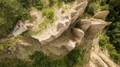 Die Erdpyramiden entstanden in der Eiszeit durch Erosion aus lehmhaltigem Moränenboden und ragen heute 30 Meter in den Himmel. Um die Erdpyramiden rankt sich eine Sage, laut derer sich eine ertragreiche Wiese dort befand, wo die Riesen heute stehen. Nach Ungereimtheiten erhielt ein Dosserbauer das Landstück, doch da sie ihm nicht wirklich gehörte, brach in der Nacht ein Wolkenbruch los. Dieser machte es nicht mehr möglich die Wiese zu bewirtschaften und stattdessen entstanden die Erdpyramiden. Die ganze Sage könnt ihr auf der Rundwanderung kennenlernen. Heute weiß man jedoch, dass es sich um Rückstände aus der Eiszeit handelt.