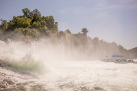 Fährt man über Jestetten zum Rheinfall, liegt auf einer Strecke von gut 20 km die Schweiz nicht nur, wie sonst, im Süden des deutschen Territoriums, sondern auch im Norden. Weit ausbauchend, zipfelt der Kanton Schaffhausen nördlich bis an den Breitengrad des Schluchsees. Den kuriosen Grenzverlauf musste die Stadt Schaffhausen 1944 als irrtümliches Ziel eines amerikanischen Bomberangriffs bitter erfahren. Historisch profitierte das ums Jahr 1000 gegründete Schaffhausen vom Warentransport der Schiffe, die hier umladen mussten. War der Rheinfall einst ein einkömmliches Hindernis, wurde er ab dem 19. Jh. zum touristischen Besuchermagneten. Auch dies nicht zum Nachteil Schaffhausens, obwohl der "Rhyfall", wie er schwyzerdütsch heißt, 2,5 km flussabwärts auf dem Gebiet der Nachbargemeinde Neuhausen liegt. Gleichwie: Erst vor 15.000 Jahren in der Würmeiszeit entstanden, jagen sommers pro Sekunde 600.000 l Wasser über die 23 m hohe, 150 m breite Klippe.