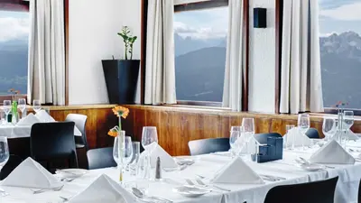 Bodenständige Tiroler Köstlichkeiten werden in der Gaststätte im Erdgeschoss angeboten. Im ersten Stock befindet sich das gehobenere Restaurant mit Panoramablick auf Innsbruck und die Berge.