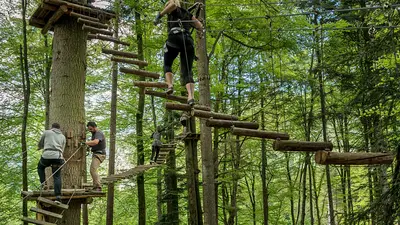 Darüber hinaus gibt es noch den Vertical Rush in den Baumwipeln: Vier verschiedene Aktivitäten lassen den Adrenalinspiegel hochschnellen. Der Giant Swing sowie der BASE Jump Simulator erlauben den freien Fall aus verschiedenen Höhen, die Speed Line ist eine Seilbahn mit Geschwindigkeiten bis zu 50 km/h, und schließlich gibt es noch die Highline, eine Slackline in zwanzig Meter Höhe - Herausforderung und grandioses Erlebnis zugleich.