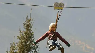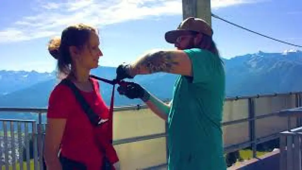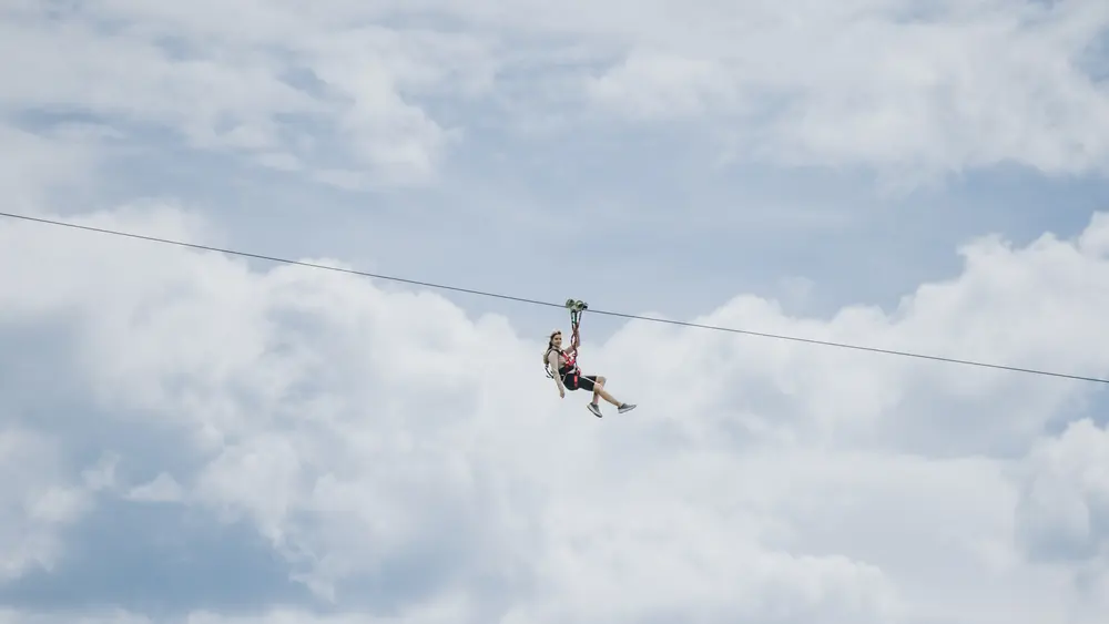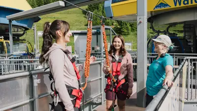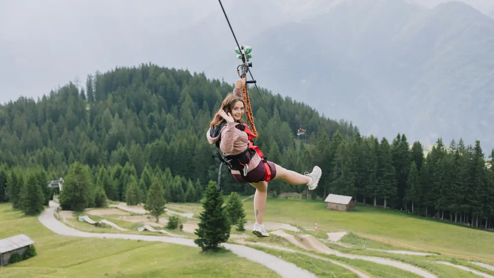 Start der Zip Line Serfauser Sauser ist an der Bergstation der Gondelbahn Sunliner. Der rasante Flug endet 385 Höhenmeter tiefer an der Talstation der Komperdellbahn. Von unten sehen die Zuschauer wie der Wind die Haare der Flieger zerzaust, während sie ihre Arme weit öffnen und ein gelöster Schrei des Glücks über die Gipfel tönt. Schöner kann sich ein Adrenalinkick nicht anfühlen.