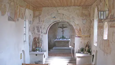 Von ursprünglich sechzehn Gemälden sind vier trotz der mehrfachen Umbauarbeiten gut erhalten geblieben. Sehenswert ist auch eine ornamentale Inschrift, bei der es sich um ein lateinisches Gedicht des Reichenauer Abts Walahfried Strabo handelt. Sie zählt zu den frühesten Zeugnissen der Reichenauer Schule und zeigt die für die karolingische Zeit typischen komplizierten Mäanderornamente.