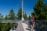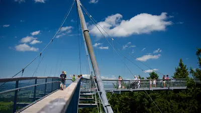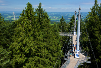Der Baumwipfelpfad erhebt sich bis auf 40 m Höhe in die Baumkronen. Von dort hat man nicht nur einen einmaligen Einblick in das Leben im Wald, sondern auch einen schönen Ausblick auf die Allgäuer Berge bis hin zum Bodensee. Alternativ zum Aufstieg über Treppen und Podesten gibt es auch einen Aufzug, am Ende kann - wer möchte - über Wackelbrücken und eine Röhrenrutsche zurück zum Boden gelangen.