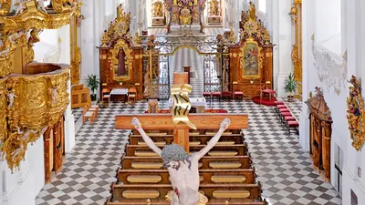 In ihrem Inneren ist der frühbarocke Hochaltar in Form eines Lebensbaums mit 84 Skulpturen besonders beeindruckend. Dieser wurde um 1610 vom Weilheimer Bildschnitzer Bartholomäus Steinle geschaffen.