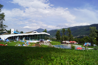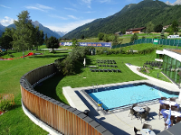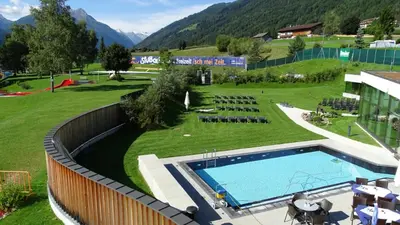 Auch der Außenbereich des Freizeitcenters hat Einiges zu bieten: Neben einem Kinderbecken und ein Sport- und Erlebnisbecken mit 400 m² Wasserfläche. Ein Solebecken mit 3% Salzgehalt bietet einen fantastischen Panoramablick bis zum Stubaier Gletscher.