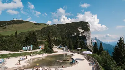 Am Triassic Beach, dem höchstgelegenen Sandstrand der Alpen, können Familien auf über 200 m² planschen, Wasserspiele und eine Kneipp-Zone genießen – ideal für eine Abkühlung an heißen Tagen. Außerdem lässt sich hier nach Fossilien graben oder eine spannende Schatzsuche starten.