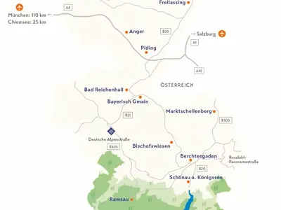 Das Berchtesgadener Land bildet die südöstliche Ecke Bayerns und ragt keilförmig in Österreich hinein: Im Osten, Süden und Südwesten grenzt der Landkreis direkt an Österreich. Das Berchtesgadener Land ist landschaftlich vielseitig: voralpin und sanft hügelig mutet es im Norden in der Region um Freilassing im Rupertiwinkel an, alpin rund um Bad Reichenhall und hochalpin an seiner südlichen Spitze in Berchtesgaden mit dem zweithöchsten Berg Deutschlands, dem 2.713 m hohen Watzmann.