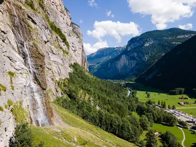 Inmitten eines beeindruckenden Trogtals zwischen imposanten Felswänden und majestätischen Gipfeln liegt Lauterbrunnen auf einer Höhe von 795 Metern. Hier stürzen 72 Wasserfälle in das Tal hinab, darunter auch der berühmte Staubbachfall, einer der höchsten frei fallenden Wasserfälle Europas, der einst Goethe zu seinem Gedicht "Gesang der Geister über den Wassern" inspirierte. Lauterbrunnen dient als Ausgangspunkt für eine Vielzahl von Ausflugszielen und lockt sowohl Natur- als auch Sportbegeisterte das ganze Jahr über an. Auch der Mürrenbachfall beeindruckt mit seiner imposanten Erscheinung, besonders während der Schneeschmelze und starken Regenfällen. Die 417 Meter hohe Mürrenfluh wird dann von schäumenden Wassermassen hinabgestürzt, was ein spektakuläres Naturschauspiel darstellt.