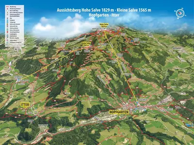 Auf die Hohe Salve gelangt man bequem von Söll oder Hopfgarten mit der Gondelbahn. Von dort führen zahlreiche Panoramawege in die Berg- und Erlebniswelt Wilder Kaiser-Brixental. Insgesamt sind in der Region über 700 km markierte Wanderwege zu finden.