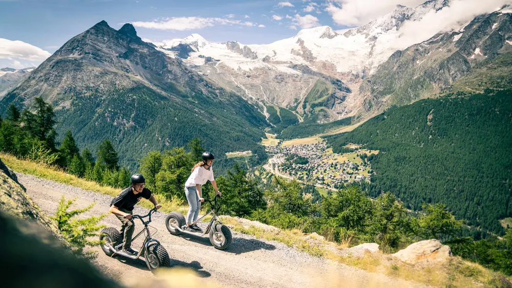 Neben dem 350 km langen Wandernetz bietet das Saastal eine vielfältige Palette an Sommeraktivitäten für Groß und Klein: Sommerskifahren und -Snowboarden, Mountain Bike, Minigolf, Pétanque, Pit Pat, Pferdetrekking, Trottiplausch, Aerobic, Kinderbergsteigen und Sonnenaufgangsfahrten - um nur Einige zu nennen. Auf der Höhe von 1.800 Metern liegend, bietet das autofreie bekannte Gletscherdorf Saas-Fee ein trockenes und reizarmes Klima, wovon vor allem Allergiker und Asthmatiker profitieren. Schon Carl Zuckmayer, Deutscher Schriftsteller und Ehrenbürger von Saas-Fee, wählte das Gletscherdorf zu seiner Heimat: `Jeder Tag, den ich nicht hier in Saas-Fee verbringe, ist für mich nur ein halber Tag. Nur hier lebe ich ganz.`