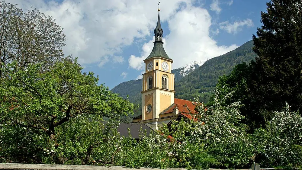 Der Ort wird bereits Ende des 13. Jahrhunderts erwähnt, was damit zusammenhängt, dass die Grafen von Tirol auf der Burg St. Petersberg ihren Gerichtssitz hatten. Das Wappen der Gemeinde zeigt weiß-rote Quadrate, was auf die Zinnen der Burg hinweisen soll und die Landesfarben von Tirol darstellen. Die Burg mit Kapelle besteht heute noch und wird als Kloster eines Ordens genutzt.