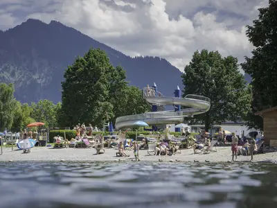 Auch am Schliersee gibt es ein tolles Strandbad mit Aquapark, Nichtschwimmerbereich, Beachvolley-Sandplatz, Tischtennis, Sprungturm, Sonnenterrasse und gemütlichem Biergarten.
