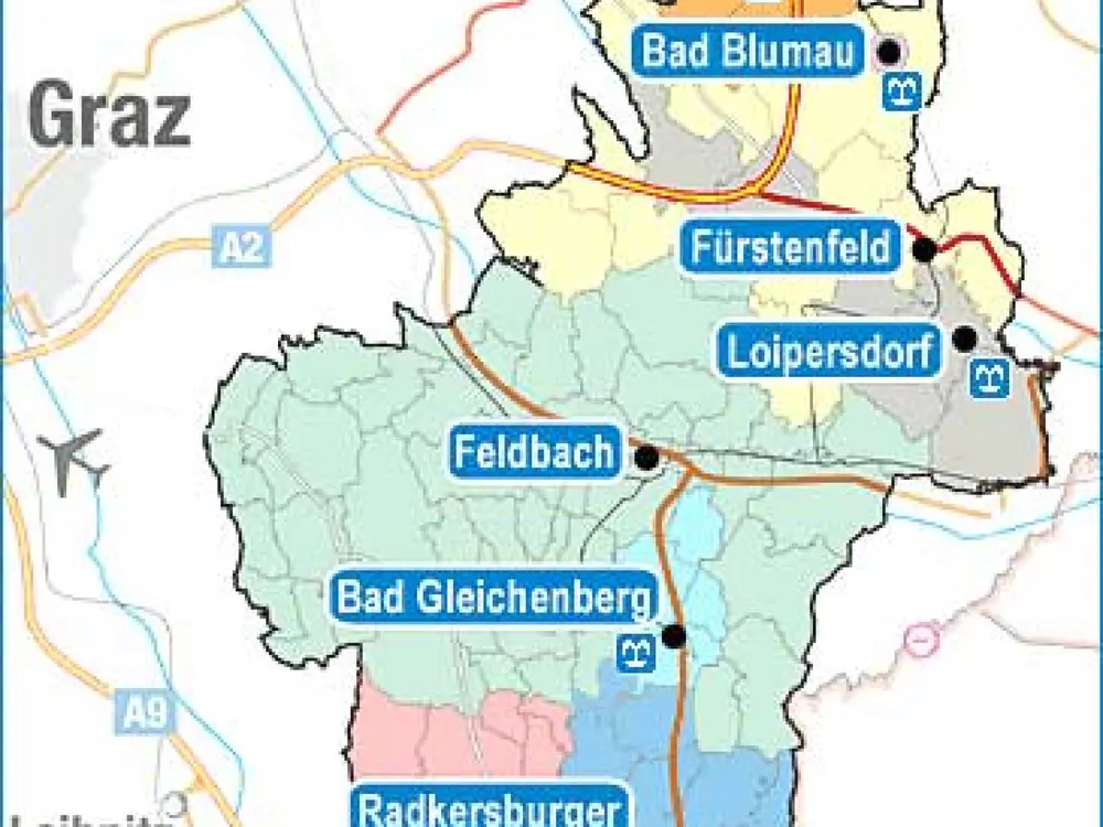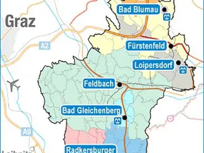 Das Thermenland Steiermark, auch bekannt als Thermen- & Vulkanland, liegt im Südosten Österreichs in der Steiermark. Die Region erstreckt sich über die Bezirke Südoststeiermark und den südlichen Teil des Bezirks Hartberg-Fürstenfeld und grenzt im Osten an das Burgenland sowie im Süden an Slowenien. Mit einer Fläche von rund 1.300 Quadratkilometern beherbergt das Gebiet etwa 120.000 Einwohner. Die sanfte Hügellandschaft und das milde Klima schaffen ideale Bedingungen für Weinbau und vielfältige Freizeitaktivitäten.