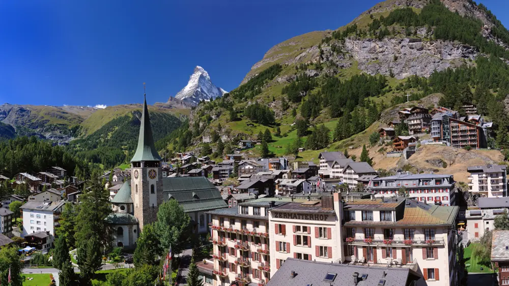 Zermatt im Wallis ist eines der beliebtesten Reiseziele der Schweiz. Das idyllische Bergdorf mit knapp 6.000 Einwohnern liegt eingebettet in einem tiefen Tal, umgeben von mehreren 4.000er Gipfeln. Der majestätische Anblick des 4.478 Meter hohen legendären Matterhorns sorgt für ein unvergleichliches Bergpanorama und machte Zermatt zu einem der berühmtesten Bergsteigerzentren der Welt. Ein Großteil der Geschichte des Dorfes bezieht sich auf den frühen Alpinismus, wie das Monte Rosa Hotel, das älteste Hotel in Zermatt, das 1855 eröffnet wurde.