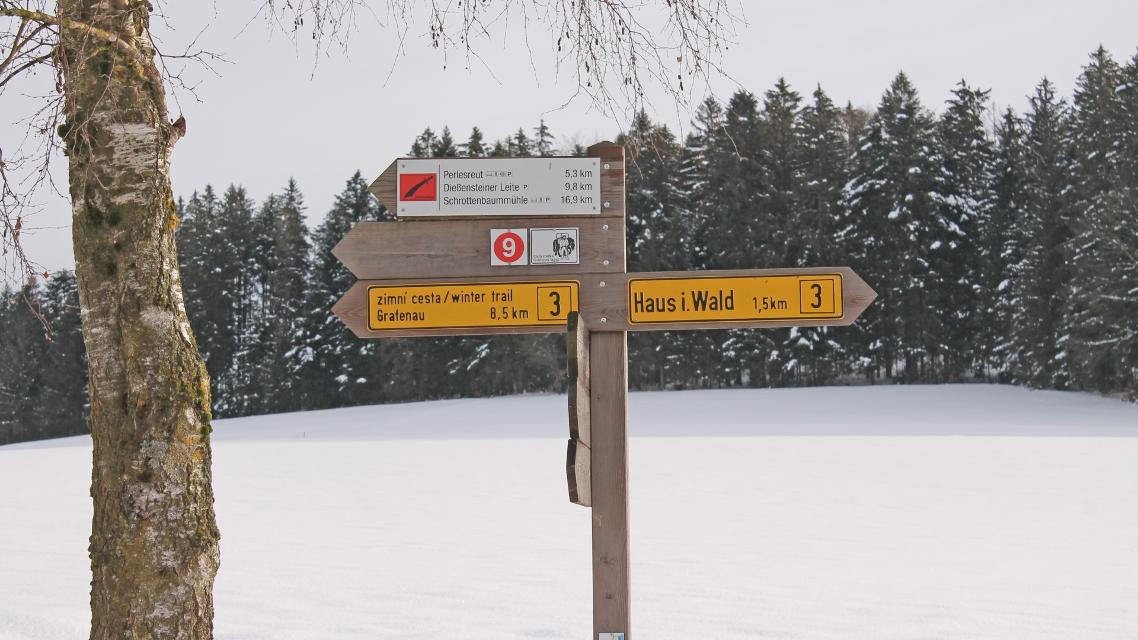Winterverbindungsweg von Grafenau nach Haus i. Wald. Schöne Ausblicke auf das Ilztal. Der Weg verläuft überwiegend auf wenig befahrenen Straßen. Markierung: gelbes Rechteck mit weißer 3 Einkehrmöglichkeiten in Haus i. Wald: Gasthof Jägerstöckl, Gasthaus Biebl (Waldesruh) im Ebenacker